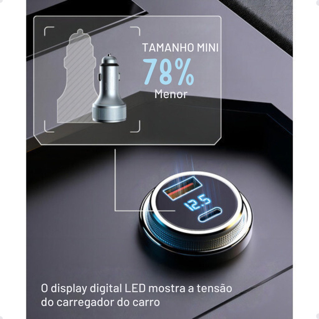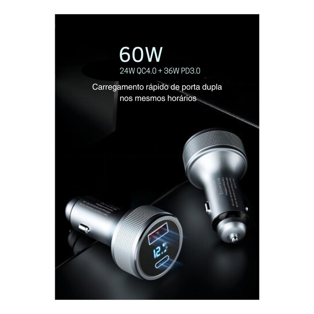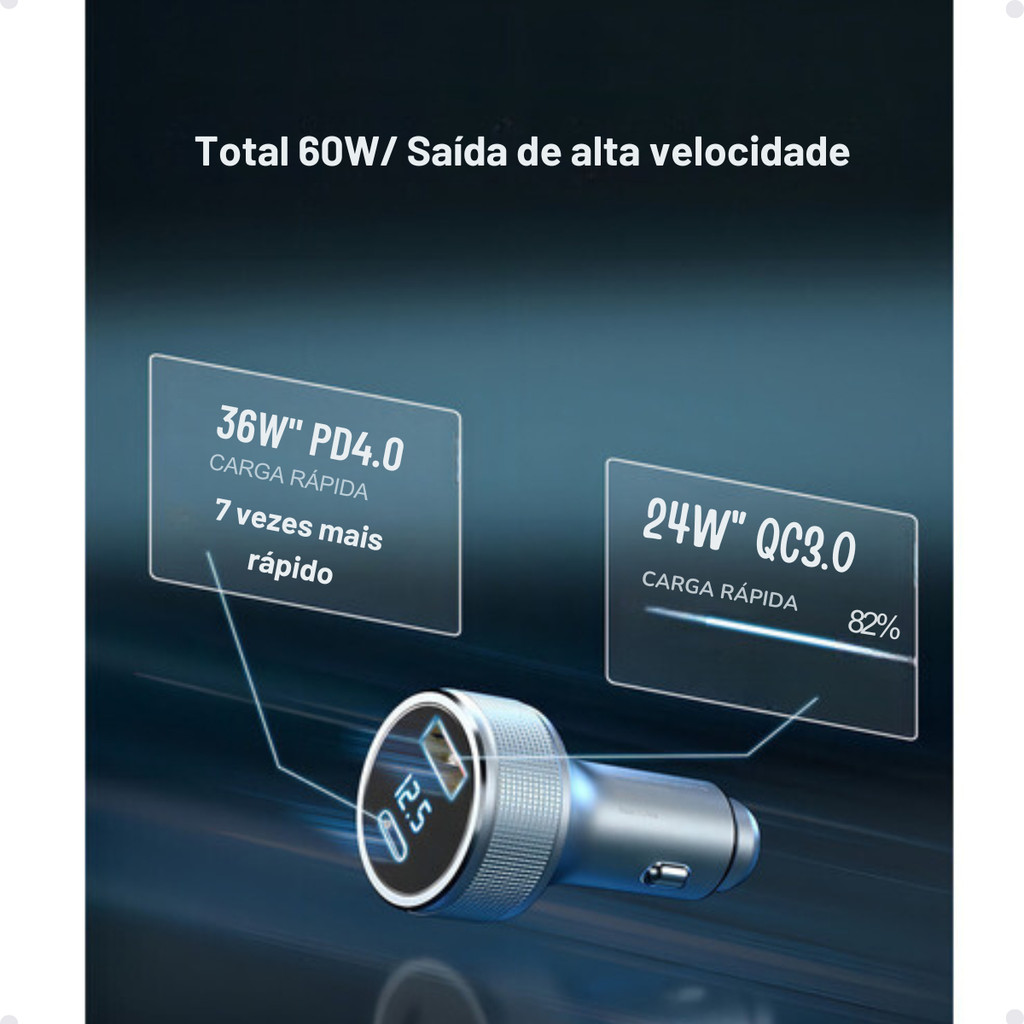 Carregador Veicular mais rápido do mercado! Com incríveis 40W de potência, é simplesmente sensacional. Surpreenda-se com sua exclusiva tecnologia de carregamento rápido, que nenhum outro modelo oferece.